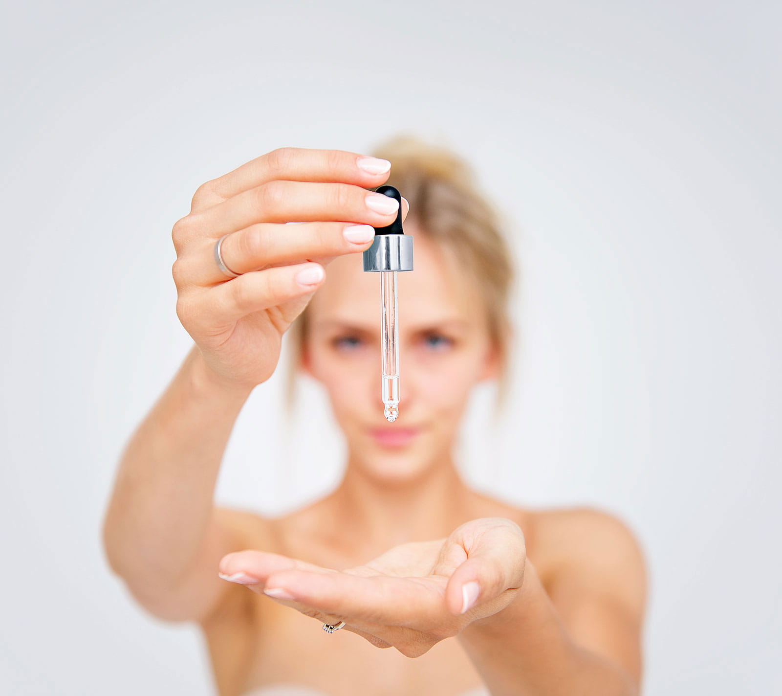 Najpierw nałóż kwas hialuronowy na wilgotną skórę, potem olej lub krem. Możesz także wymieszać kwas od razu z kosmetykiem. Najlepiej nakładać go na zwilżoną skórę.