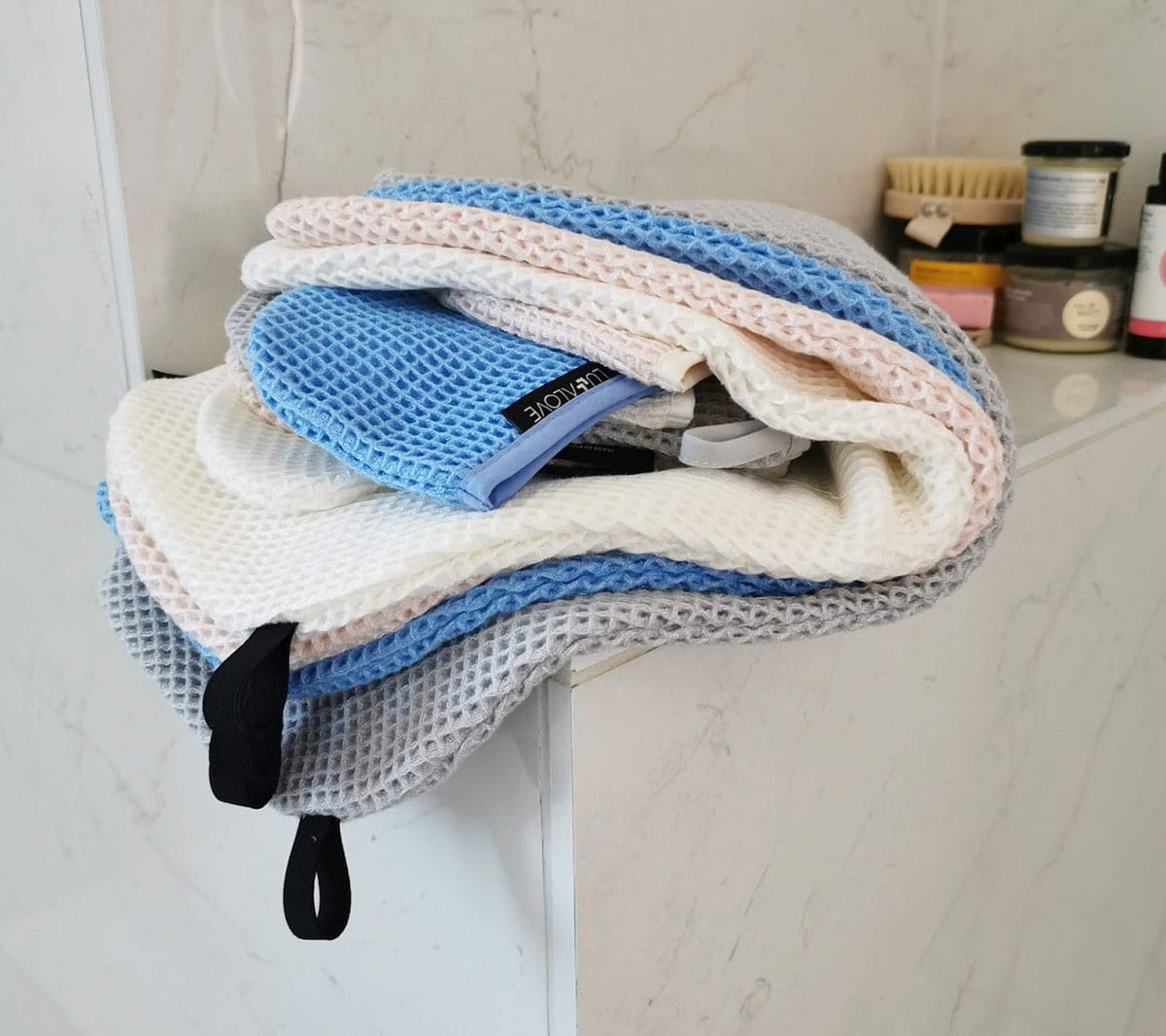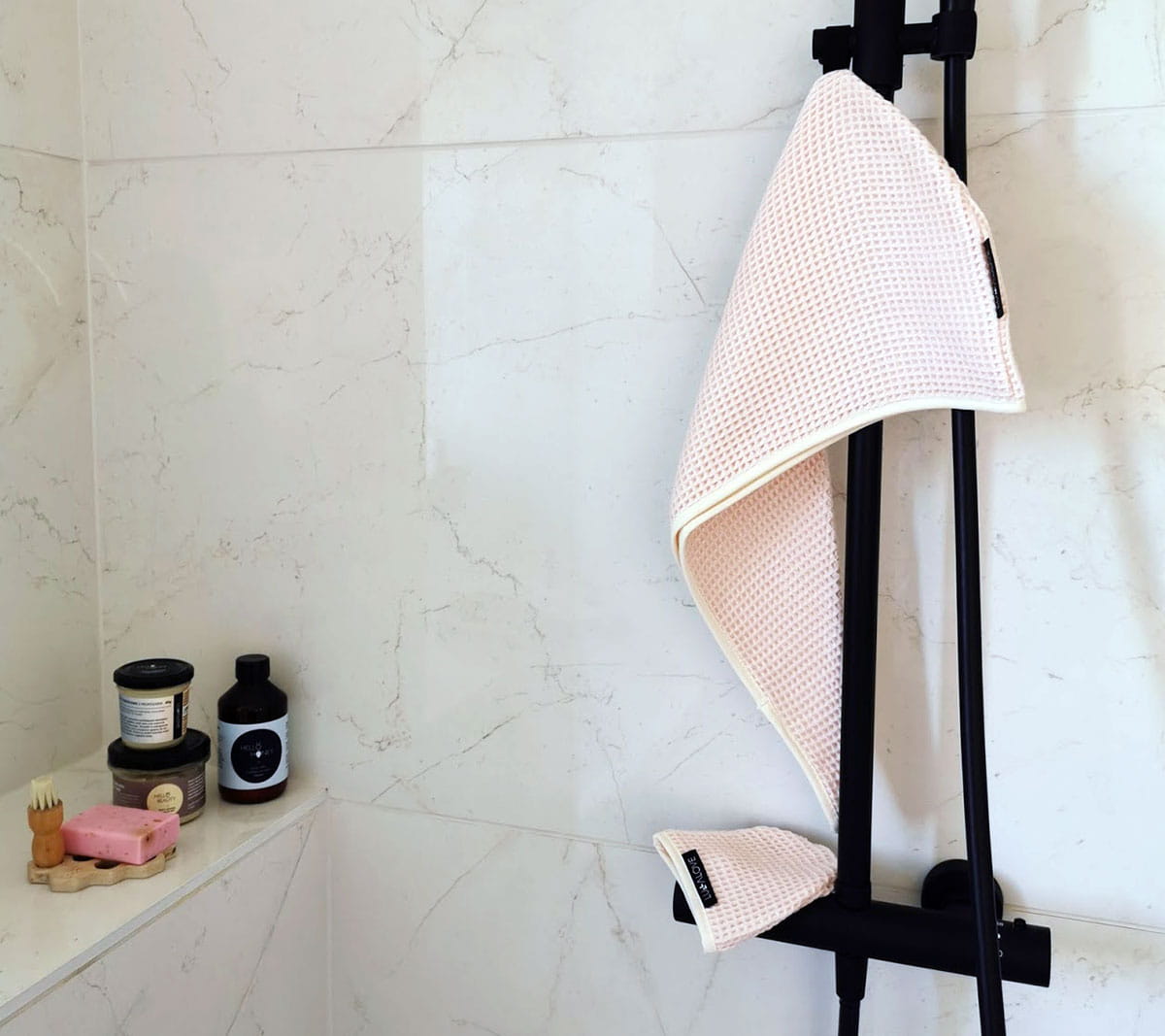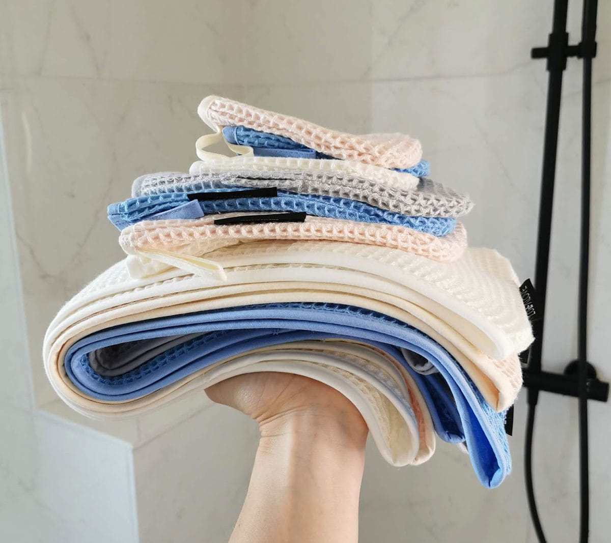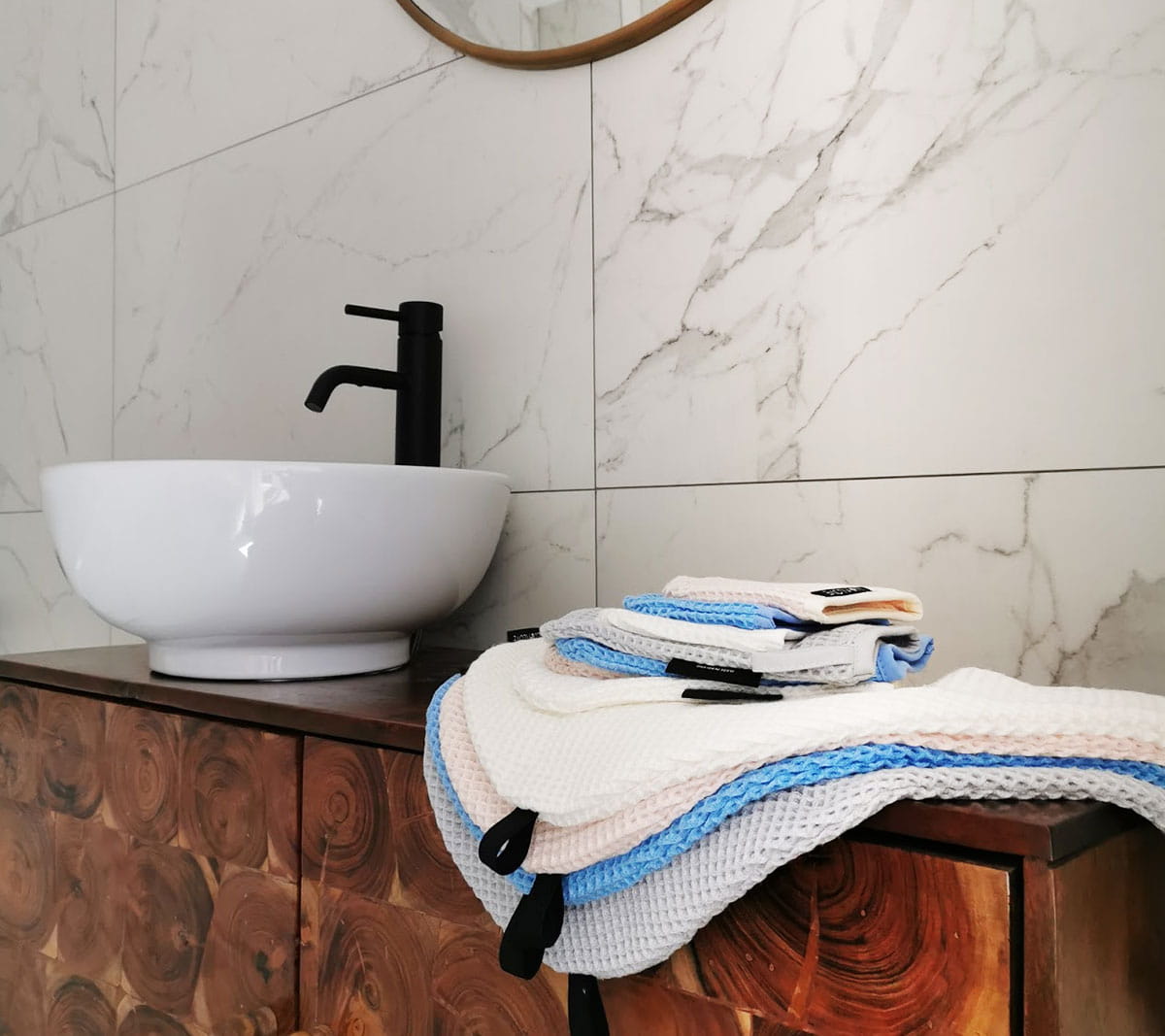 Materiał to 100% wafel wykonany z przędzy bambusowej. Przędza jest w 100% naturalna, a barwniki bezpieczne również dla dzieci. Co więcej, bambus posiada właściwości antybakteryjne, jest niesamowicie delikatny i przyjemny w dotyku. Rekomendowany osobom z AZS czy podrażnioną skórą. Mokry ręcznik nie śmierdzi, nie jest to szybkoschnąca mikrofibra.